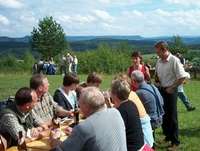 Trotz seines engen Terminplanes ließ es sich Ministerpräsident Dieter Althaus nebst Gattin nicht nehmen, am Sonntagnachmittag den über 80 Teilnehmern des 8. Wandertages der CDU Eichsfeld in Kella einen Besuch abzustatten. Zuvor hatten die Wanderfreunde nach dem Gottesdienst und einem zünftigen Frühstück eine geführte Rundwanderung auf der Gobert mit den markanten Aussichtspunkten erleben dürfen. Bei Sonnenschein und phantastischer Fernsicht begeisterte das einmalige Panorama des thüringischen und hessischen Berglandes.